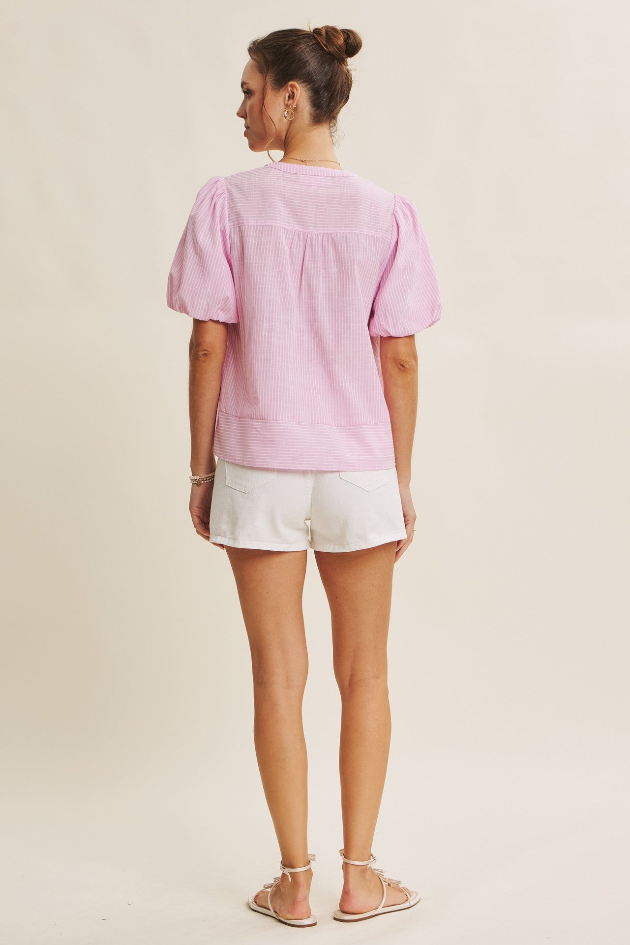 You’re going to love how light and feminine this blouse feels the moment you put it on. With its soft pink stripes and airy silhouette, it’s the perfect piece to add a fresh, polished touch to your everyday style.